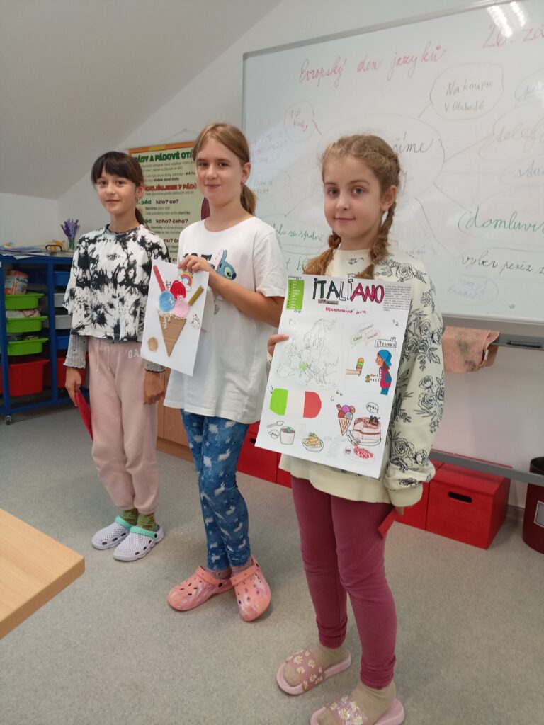 Největším lákadlem se však stala praktická část – všichni si společně připravili a upekli pravou italskou pizzu, na které si nakonec pochutnali. Vyvrcholením projektu byla prezentace jednotlivých týmů před třídou, během které se ostatní spolužáci dozvěděli spoustu nových a zajímavých informací. Díky tomuto projektovému vyučování si žáci nejen rozšířili znalosti o evropských jazycích a kulturách, ale zároveň si vyzkoušeli týmovou spolupráci, tvůrčí činnost a komunikaci. Evropský den jazyků se tak proměnil v zábavné a smysluplné učení.