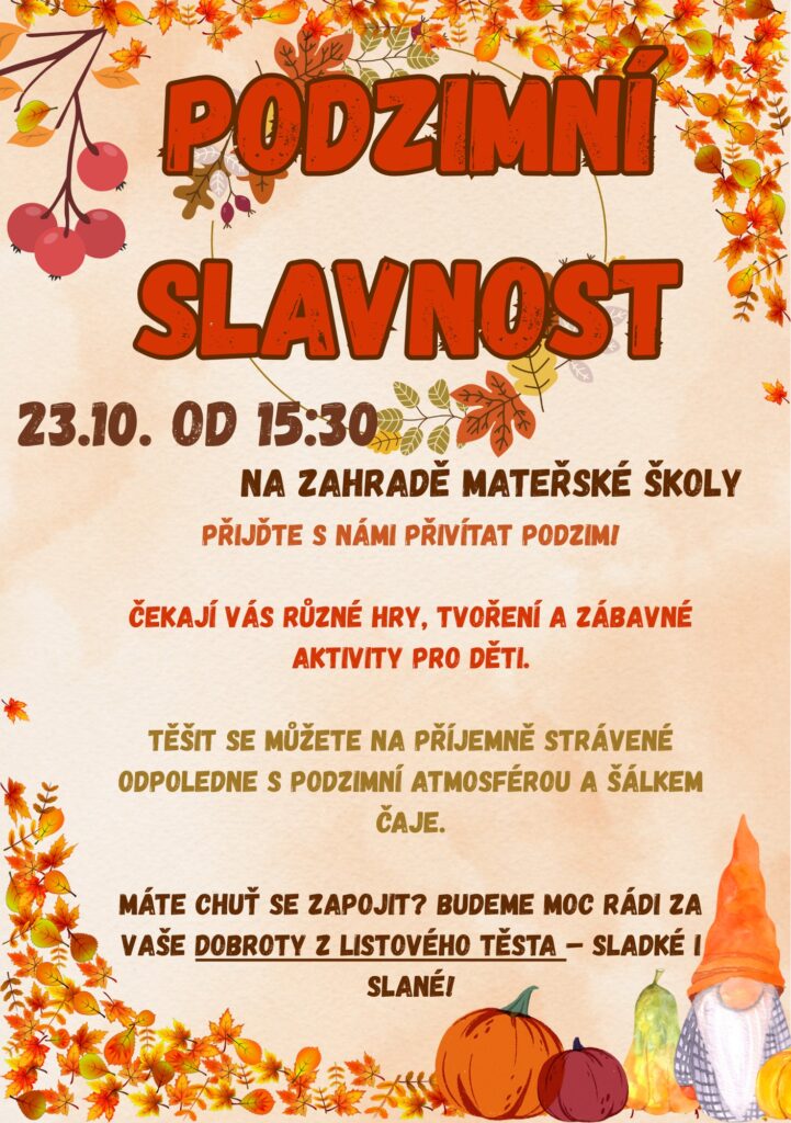srdečně Vás zveme na naši Podzimní slavnost, která se uskuteční ve čtvrtek 23.10. od 15:30 hodin na zahradě mateřské školy, kde na Vás budou čekat aktivity s podzimní tématikou.