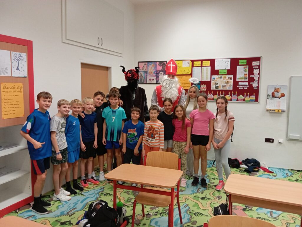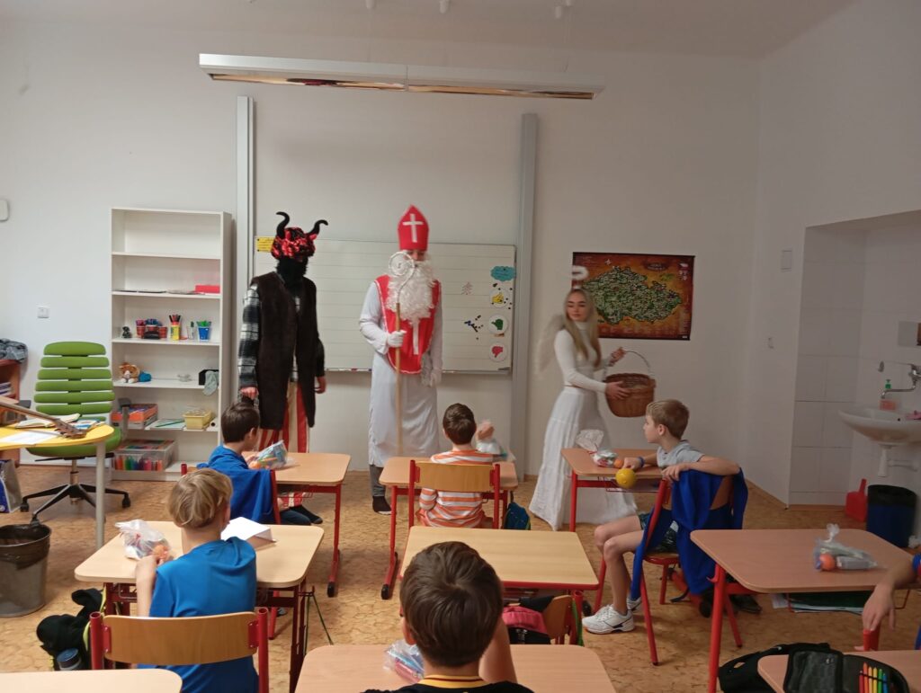 Zavítala k nám také tradiční trojice – Mikuláš, anděl a čert. Ti prošli všechny třídy a předali dětem nadílku, čímž krásně završili celé dopoledne.