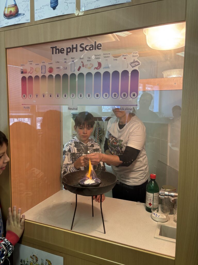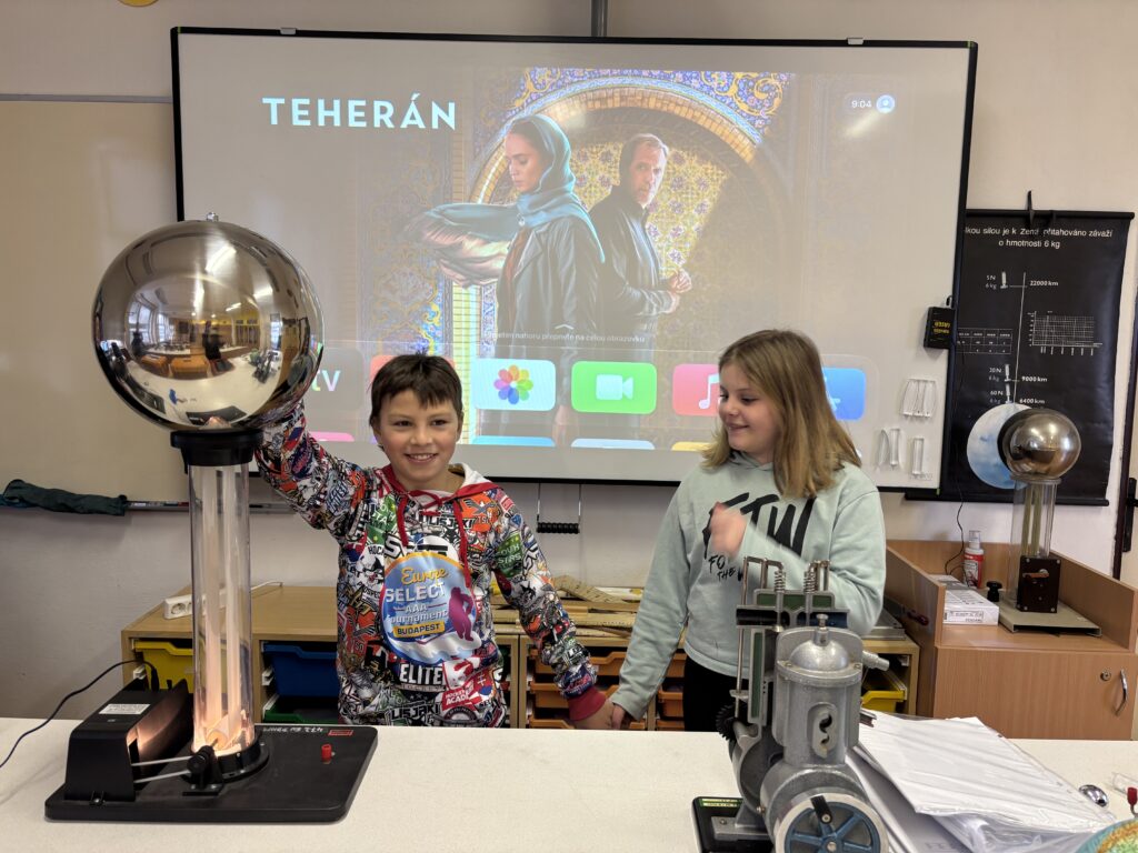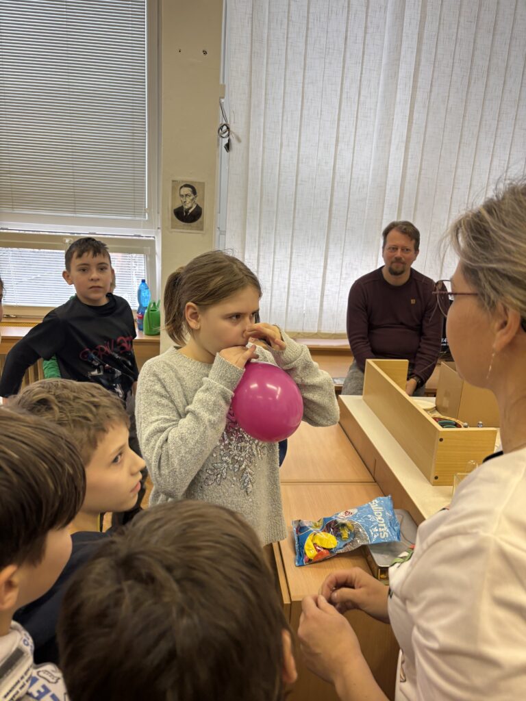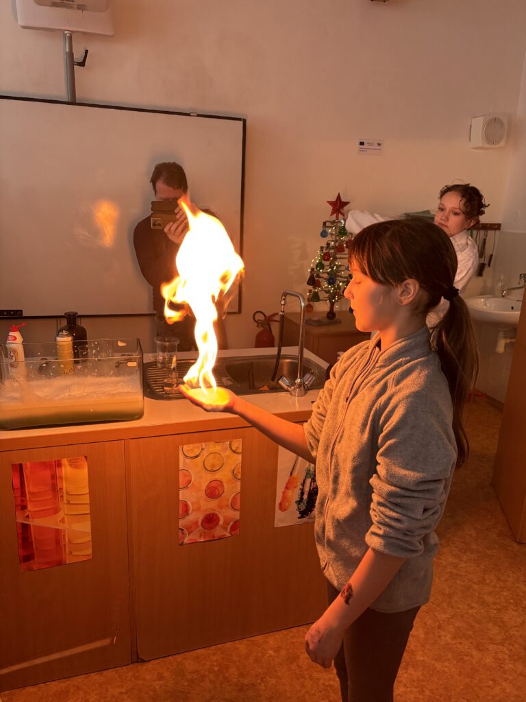 Během návštěvy jsme si prohlédly celou školu – třídy, odborné učebny, jídelnu i tělocvičnu. Největší nadšení vzbudil připravený program v učebnách fyziky a chemie. Ve fyzice si děti vyzkoušely brýle pro virtuální realitu i zajímavé pokusy, v chemii jich bylo snad ještě víc. Každý žák si odnesl domů „zlaťák“ vyrobený z dvacetikoruny, nasmáli jsme se při pokusech s heliem a ti nejstatečnější dokonce hořeli.