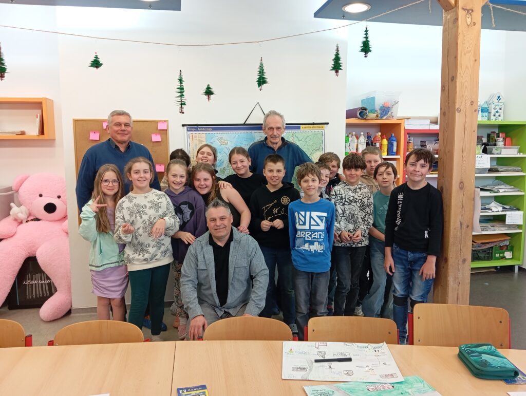 Naši páťáci pracují na projektu Křížem krážem Slezskou bránou, kterou pořádá SVČ Klíč ve Vratimově. Pro zpracování prezentace k tomuto projektu potřebují i videoukázky, které mapují jejich práci. Nyní se zaměřili na zpracování otázky: Čím by mohla být obec Žabeň ještě zajímavější? Pro získání odpovědí nejen na tuto otázku se zúčastnili besedy s panem starostou Žabně, dědečkem Matyáše Stachovce panem Vyvialem a bývalým panem starostou Staré Vsi nad Ondřejnicí panem Dvořákem, strýcem Báry Dvořákové.