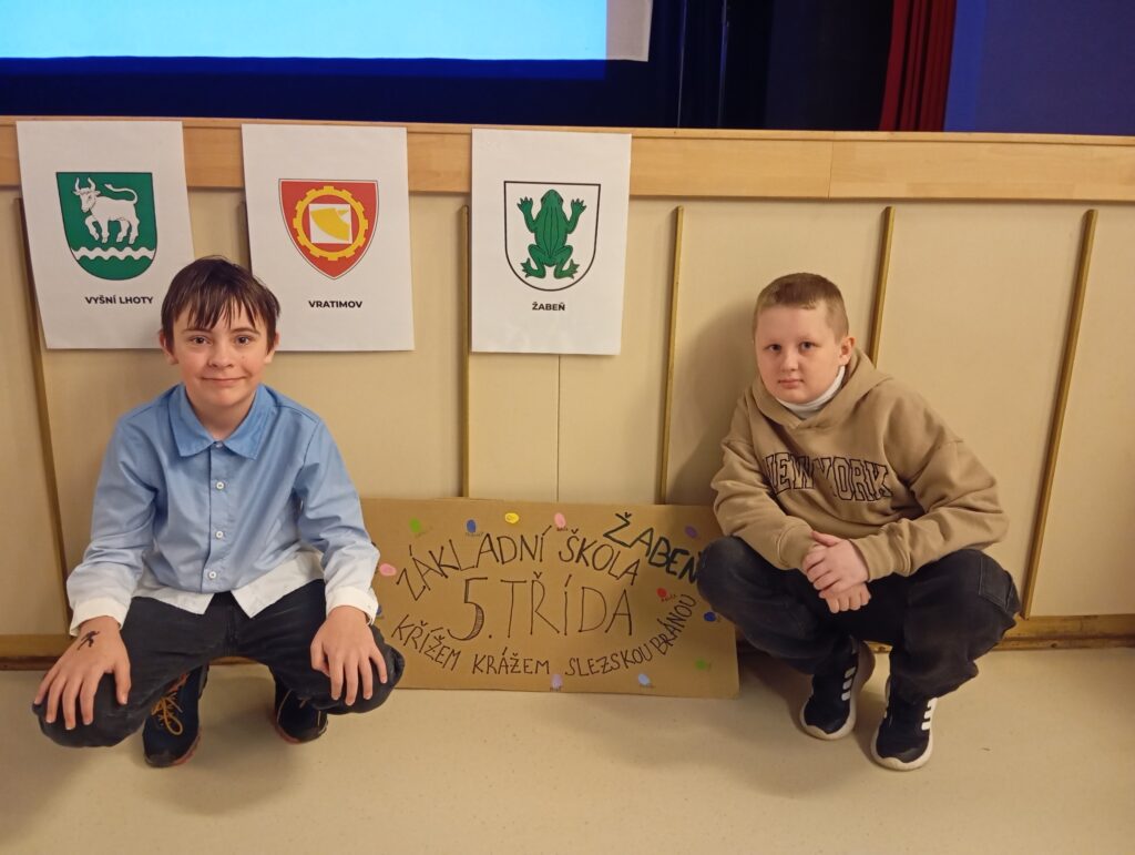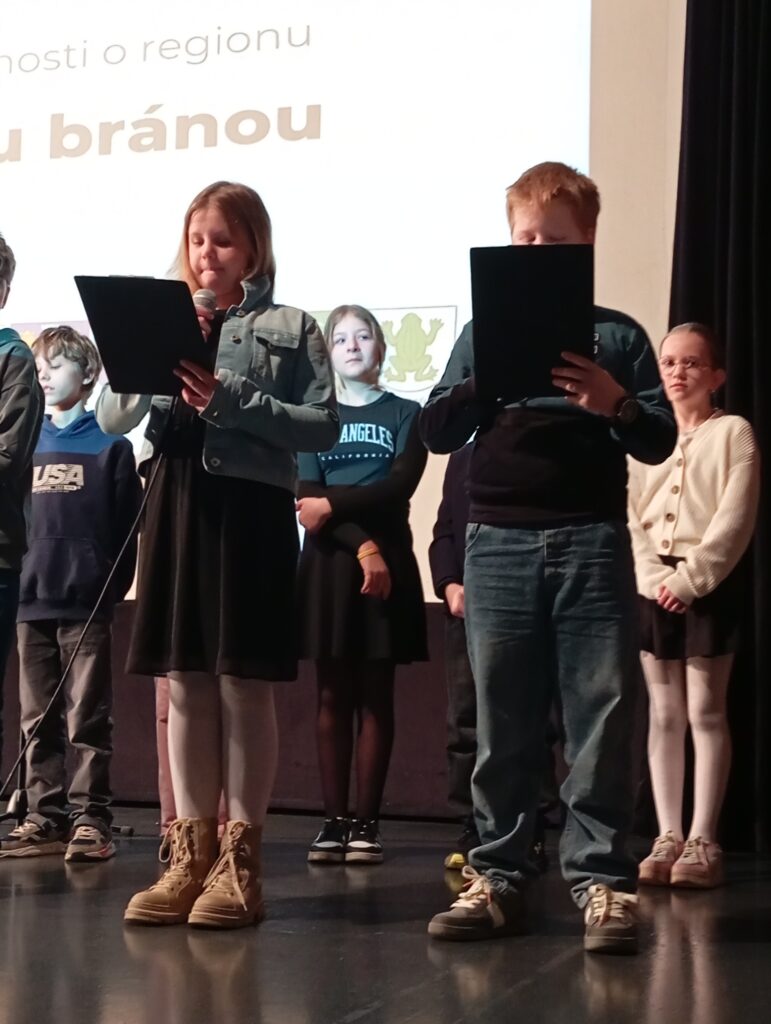 Páťáci naší školy předvedli odvahu na pódiu i v promítací kabině. Moderátoři byli Evelin s Adamem, video-prezentaci pouštěly Kája s Emčou, Adrian s Matyášem drželi pěkný transparent s logem, ve VV vyrobený. Za vzorně sestříhaná videa i velmi působivou závěrečnou píseň „O Žabni“ vděčíme žačkám 5. ročníku a jejich rodičům.