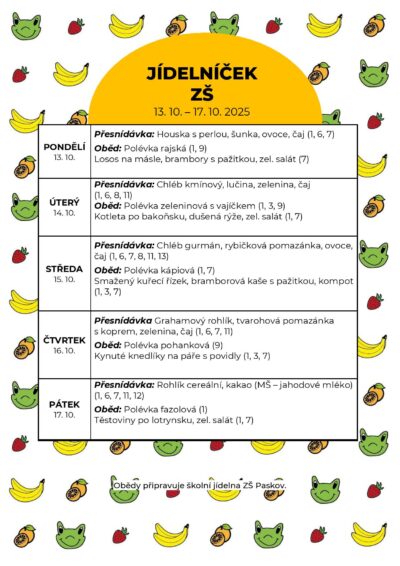 Obědy dětí do 10 let (1. až 4. ročník) 600 Kč/měsíc (30 Kč/oběd)